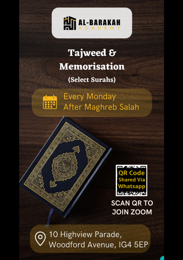 | 📍Location | Al-Barakah Academy (10 High view parade Woodford Avenue IG4 5EP) |